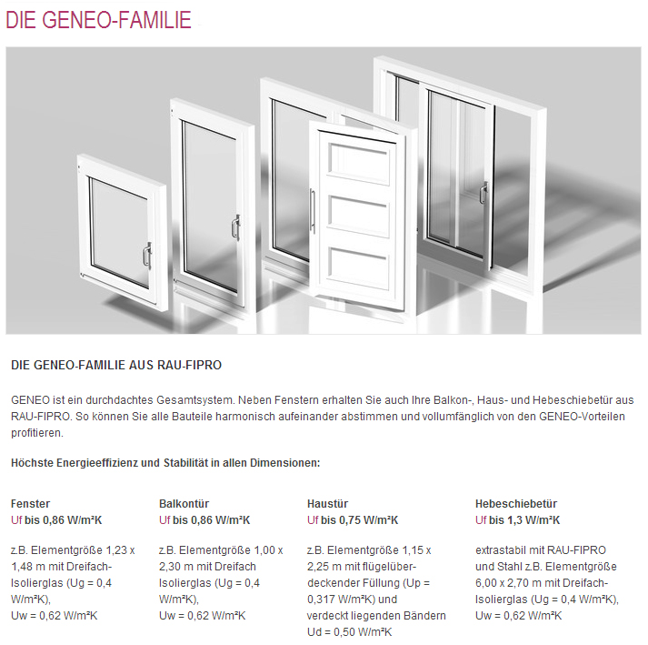 Durch die ausgeklügelte Rahmenkonstruktion, die Bautiefe von 86 mm und dem bewährten Profilkern aus RAU-FIPRO steht GENEO für Energieeffizienz in Perfektion, mit der Sie sogar die Anforderungen der Energieeinsparverordnung (EnEV) übertreffen und den Wert Ihrer Immobilie langfristig sichern. Geld verheizen muss also nicht sein!